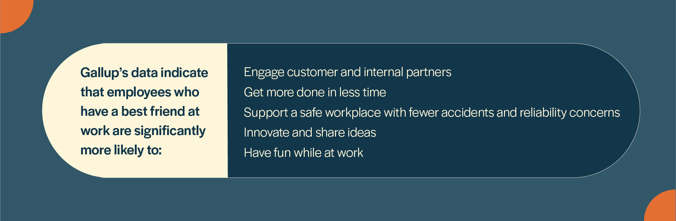 “Gallup data indicate that having a best friend at work is strongly linked to business outcomes, including profitability, safety, inventory control and retention.”